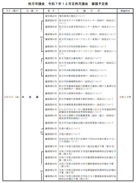 枚方市議会 2025年(令和7年)12月定例月議会は12月5日より開催されます。条例案件、補正予算等の審議となります。一般質問は12日から。