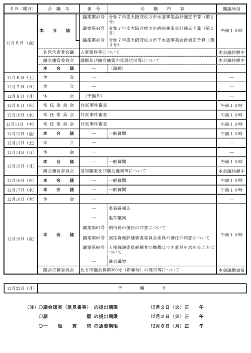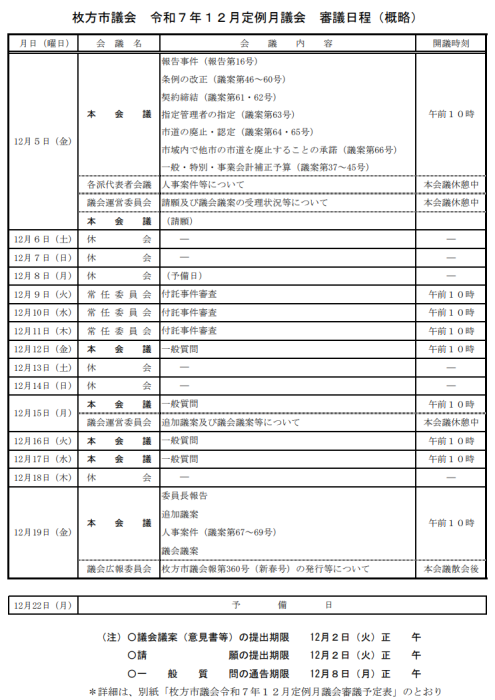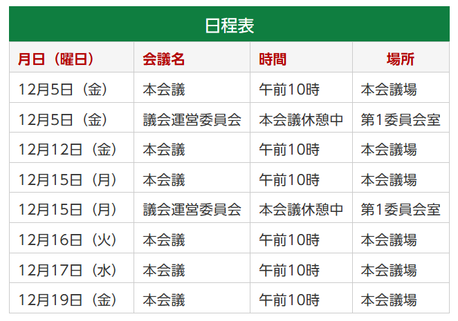 ▶ 2025(令和7)年12月定例月議会の審議日程(概略)・審議予定表