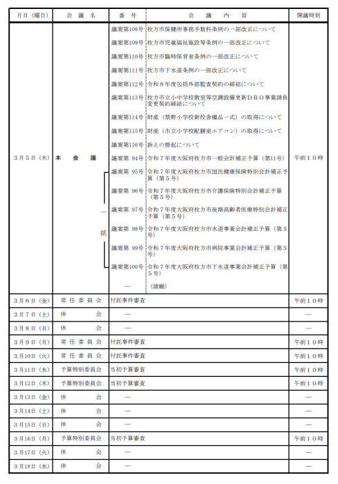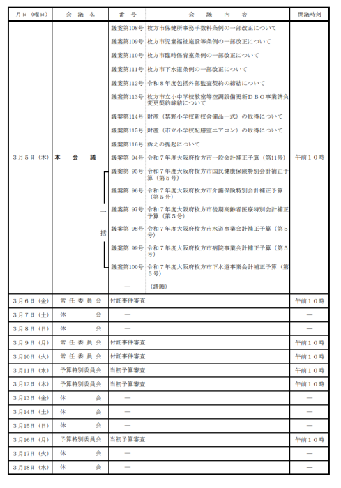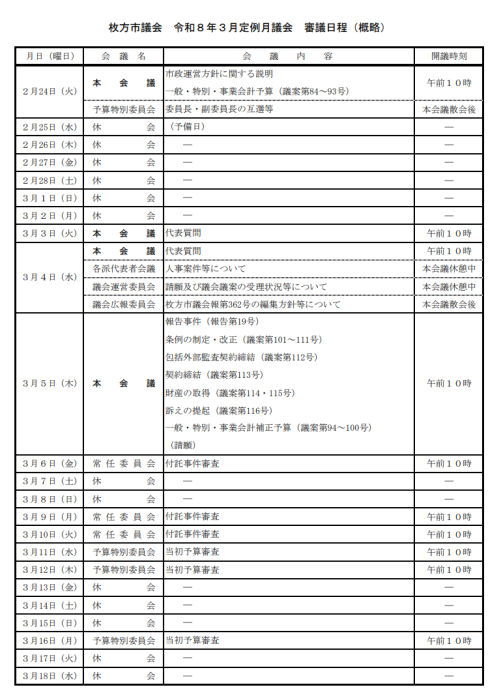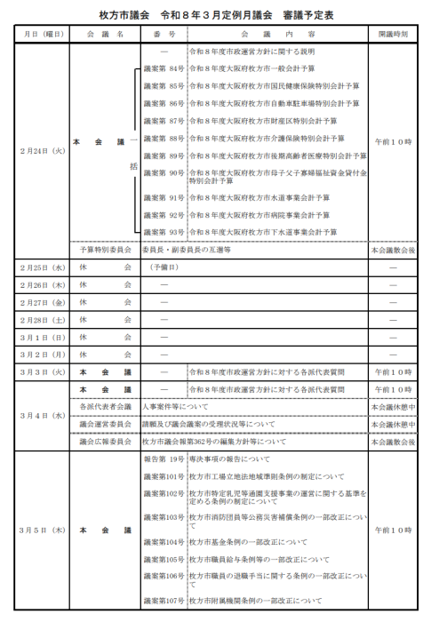 枚方市議会 2026年(令和8年)3月定例月議会は2月24日より開催されます。条例案件の他、2026(令和8)年度当初予算、人事案件等の審議となります。