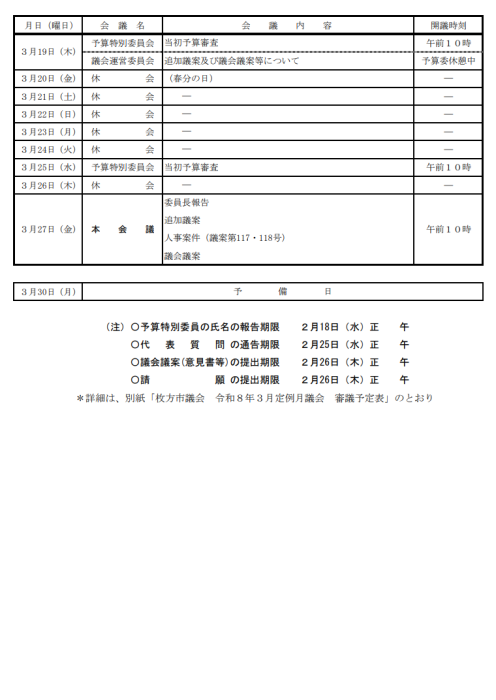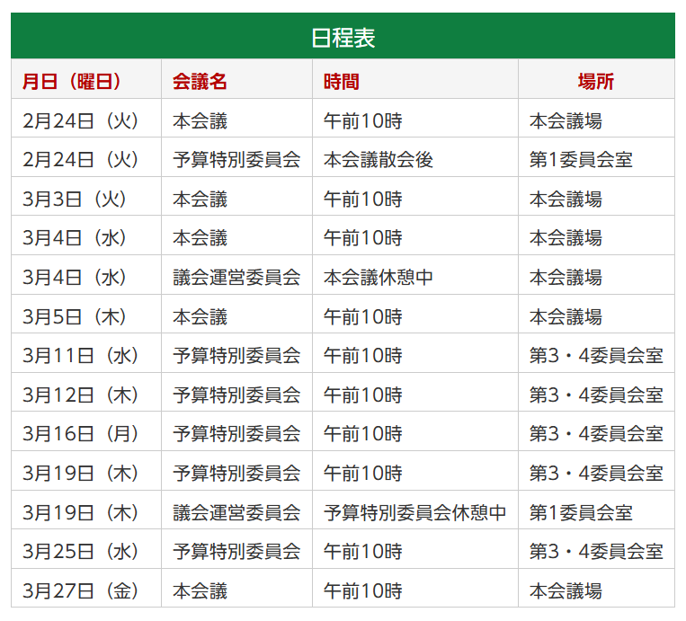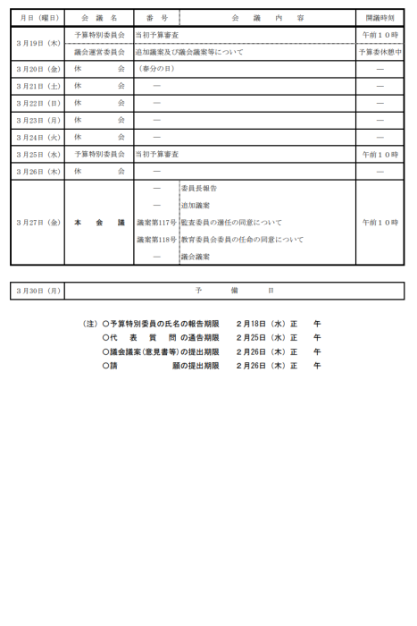 ▶ 令和8(2026)年3月定例月議会の審議日程(概略)・審議予定表