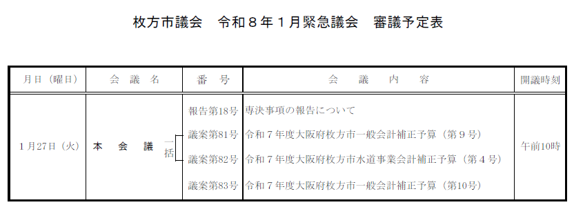 1月27日に枚方市議会緊急議会が開催されます。物価高騰対応重点支援地方創生臨時交付金を活用する市独自施策を行うための予算等の審議となります。