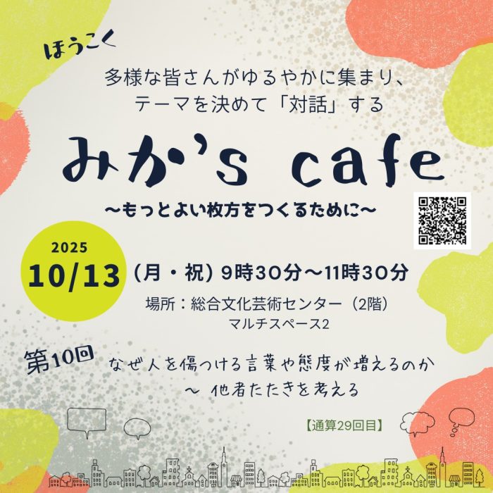「正義」を問い直す~「誰かのせい」を超えて見つめる社会のかたち。10月13日、「なぜ人を傷つける言葉や態度が増えるのか ~ 他者たたきを考える」をテーマに「みか’s cafe」を開催しました。