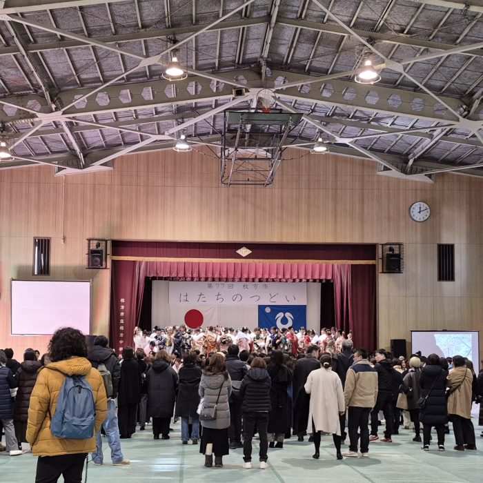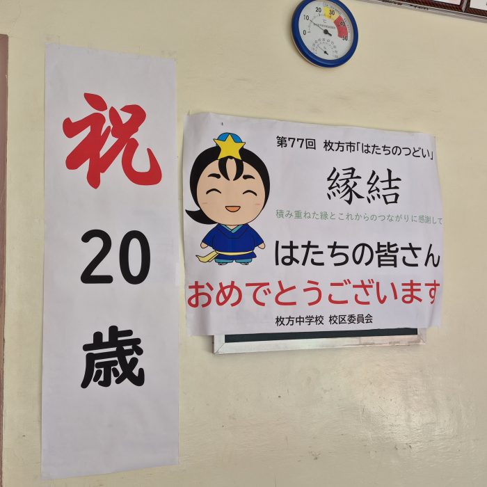 私が出席した枚方中学校会場は、対象者は230人(昨年度254人、一昨年度211人)でした。オープニングでは枚方中学校吹奏楽部の演奏が会場を彩り、フィナーレでは枚方幼稚園の園児による鳴子踊りが披露され、世代を超えて温かい拍手が送られていました(◠‿・)—☆