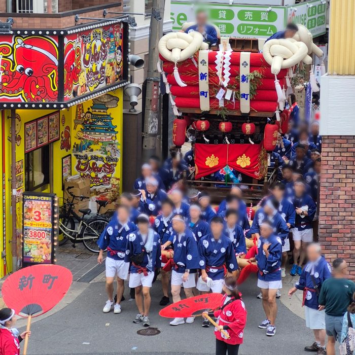 「ふとん太鼓」とは、朱色の布団を5枚重ねた形のみこし(高さ約4m、重さ約1トン)のことで、枚方では約300年前の江戸時代に始まったようです。現在は、伝統を受け継ぐ四町(岡本町、岡東町、新町、三矢町)が枚方宿地区周辺を勇壮に練り歩きます。