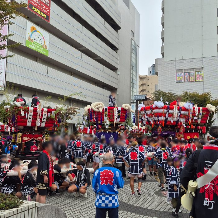 午後は、旧街道沿いの練り歩きです。お昼休憩の後、12時30分頃に岡本町公園を出発(三矢町は三矢公園でお昼休憩)し、三矢公園、枚方公園駅前西口広場、鍵屋、三矢公園、岡本町公園と巡行し(14時過ぎ)、各町へと戻って行きました。