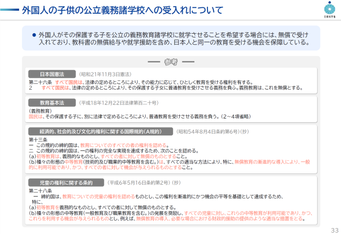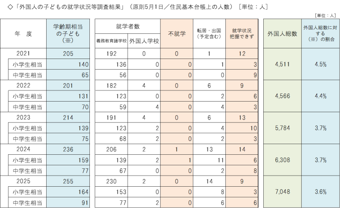 国の「外国人の子供の就学促進及び就学状況の把握等に関する指針」でも、自治体による主体的な就学案内、相談体制の整備、就学状況の把握が責務として求められている。
