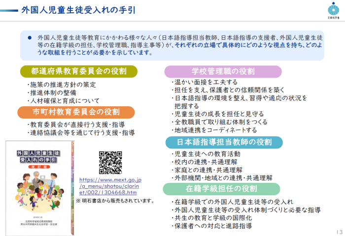 本市に配置されている日本語指導教員は、文部科学省の考え方を踏まえ、日本語指導に加え、在籍学級担任への指導助言や校内の支援体制づくりを担う役割を果たしている。