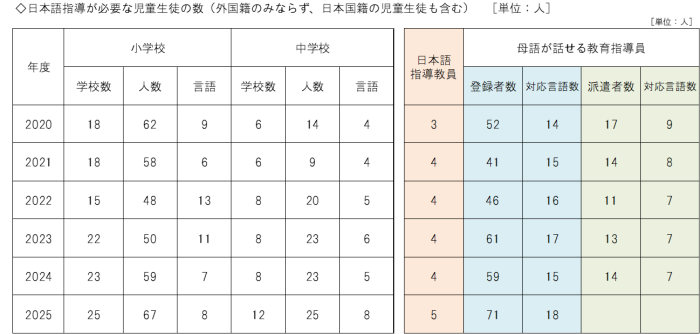 現在、対象児童生徒数は増加傾向にあることから、指導時間や体制の在り方については課題も認識しており、今後もより効果的な日本語教育の充実に向けて検証と改善を進めていく。