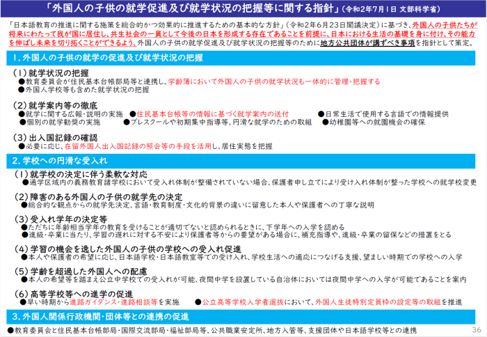 国の「外国人の子供の就学促進及び就学状況の把握等に関する指針」でも、自治体による主体的な就学案内、相談体制の整備、就学状況の把握が責務として求められている。