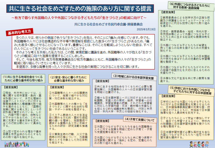 ▶ 3月19日、「共に生きる社会をめざすための施策のあり方に関する提言~枚方で暮らす外国籍の人々や外国につながる子どもたちの 『生きづらさ』の軽減に向けて~」が枚方市議会にも提出されました。(2025/04/01)