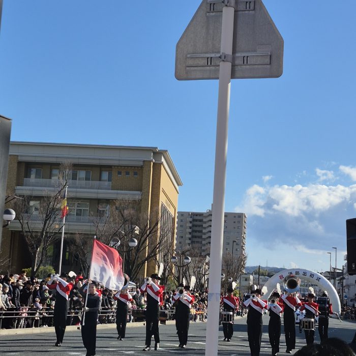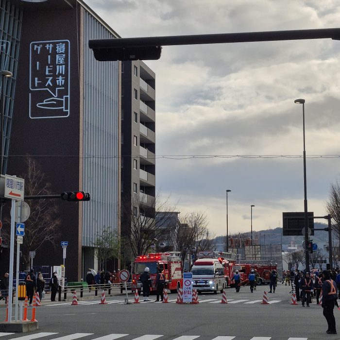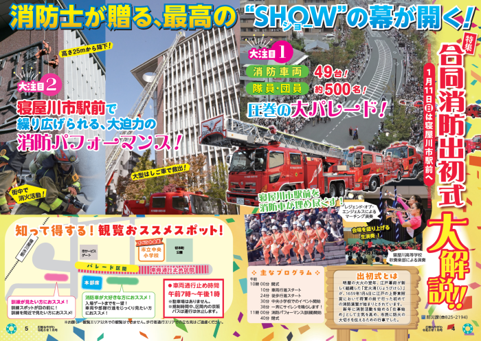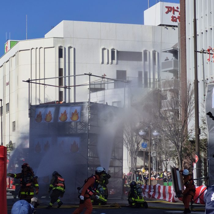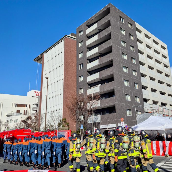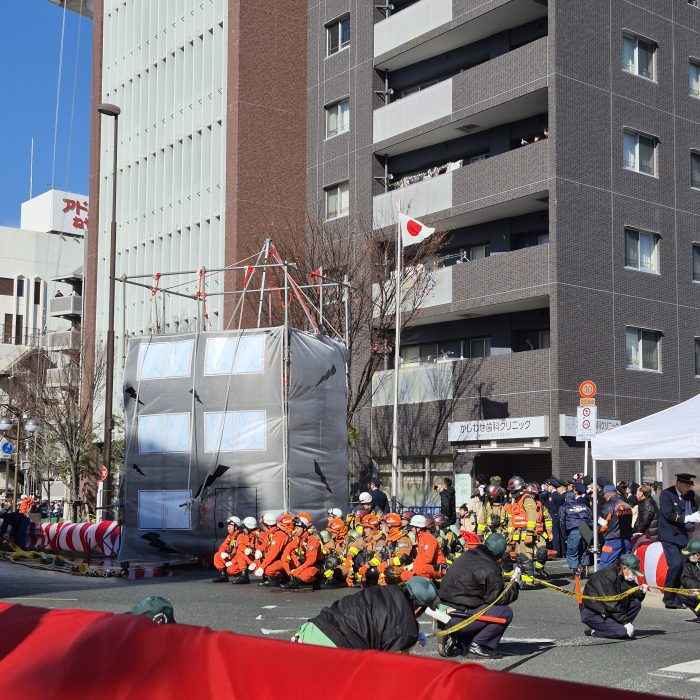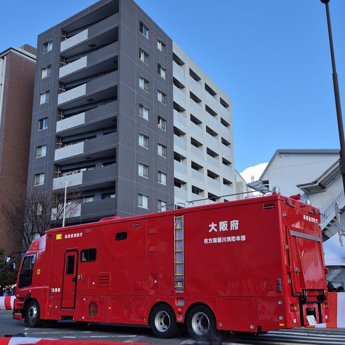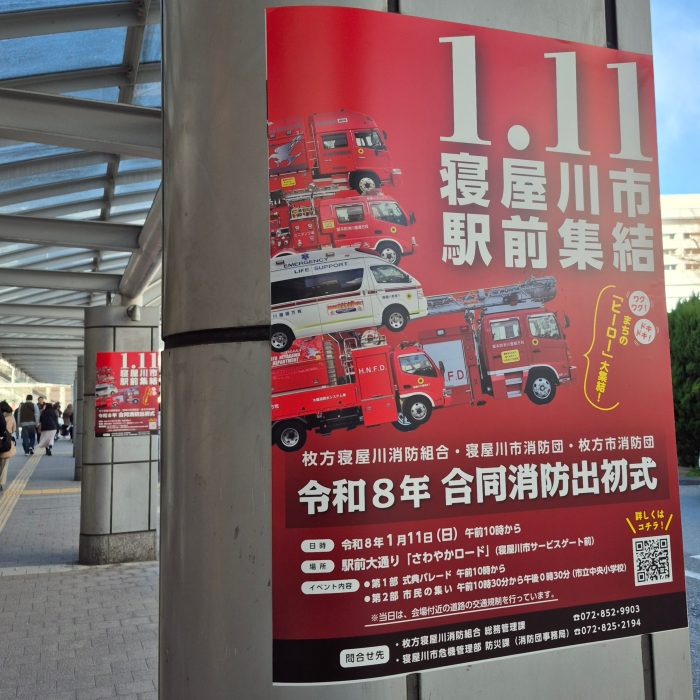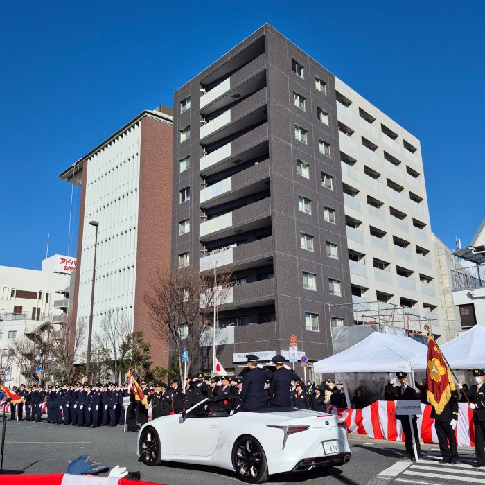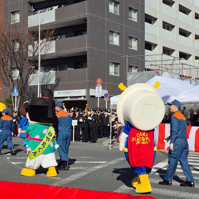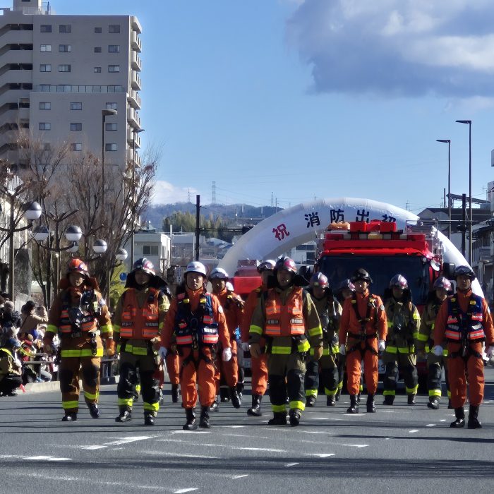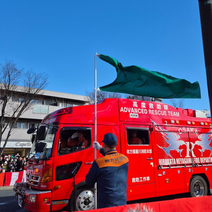 子どもたちから高齢者までが見守る中、寝屋川市駅前で繰り広げられた大迫力の消防パフォーマンス。1月11日、2026(令和8)年の合同消防出初式に来賓として出席しました。