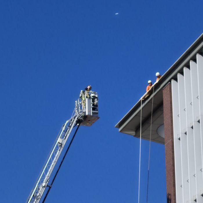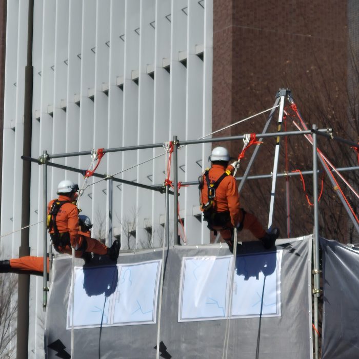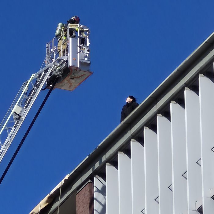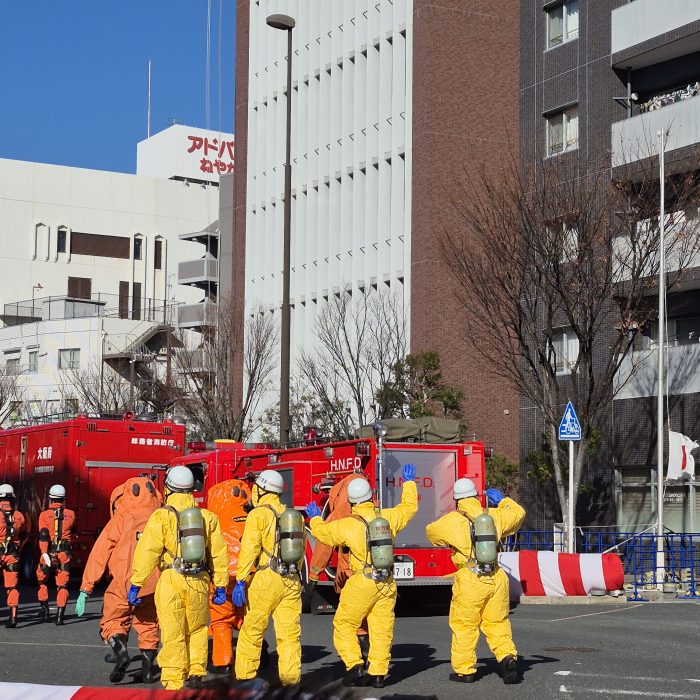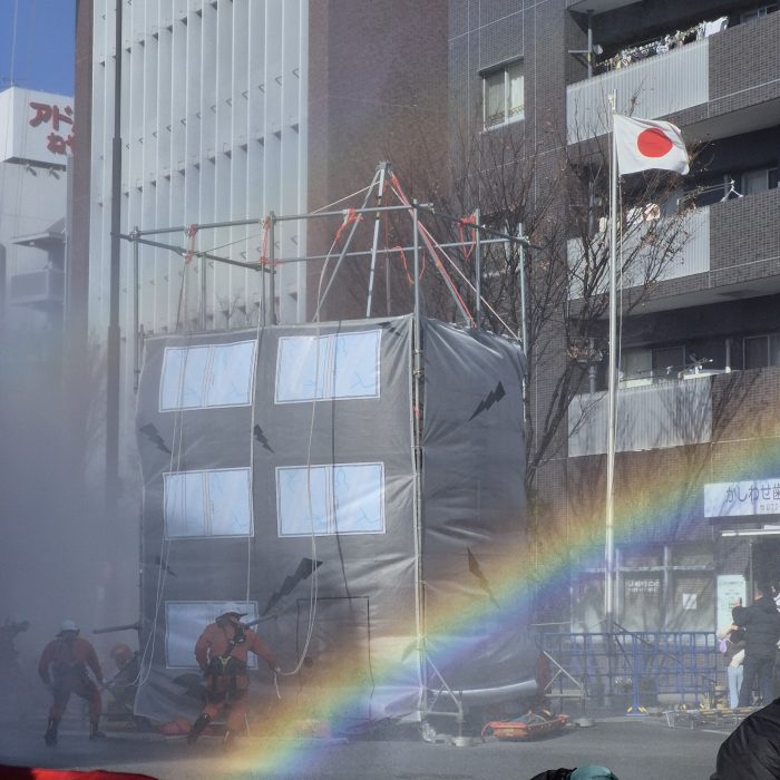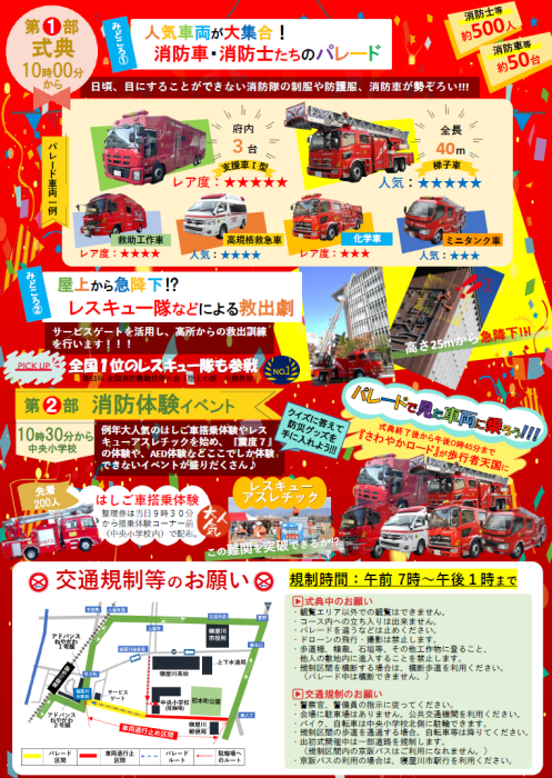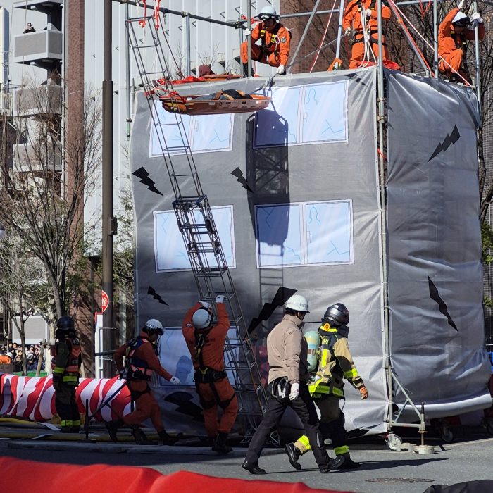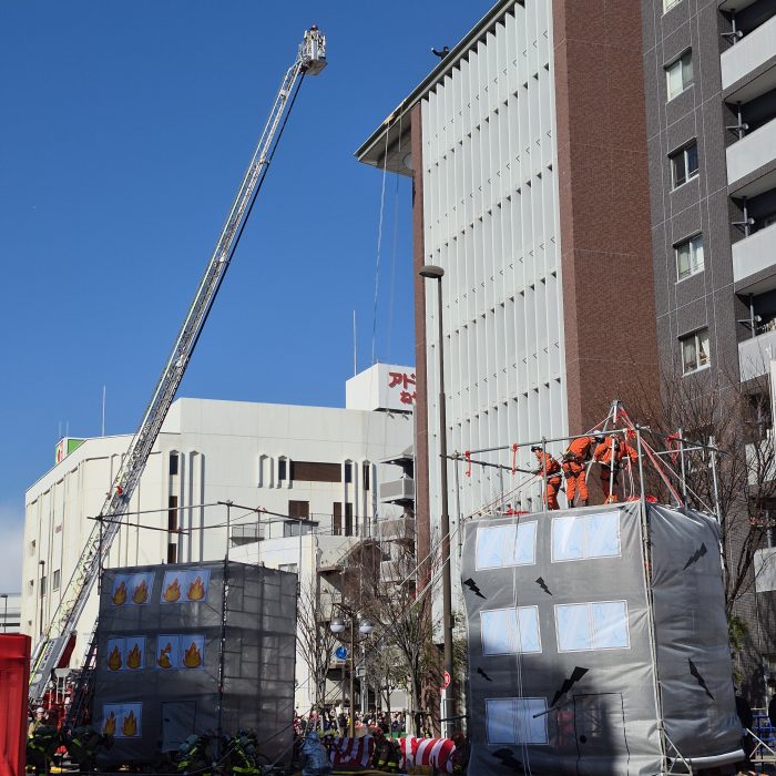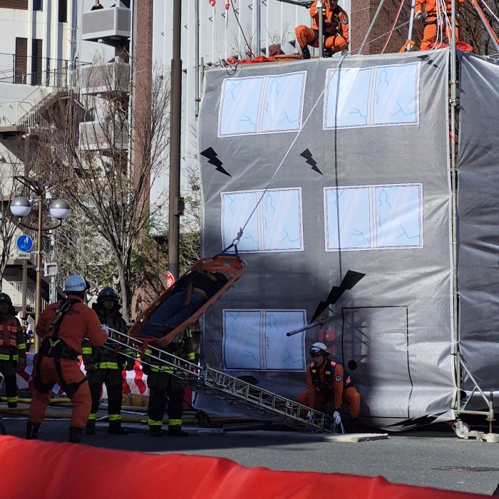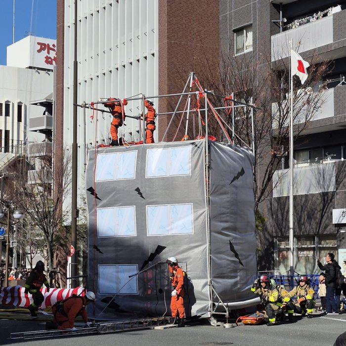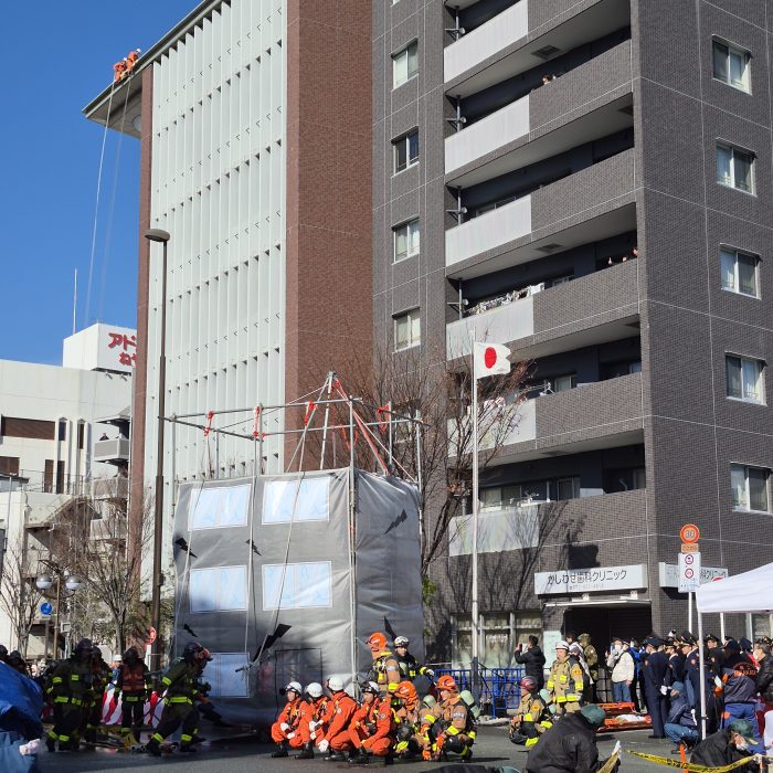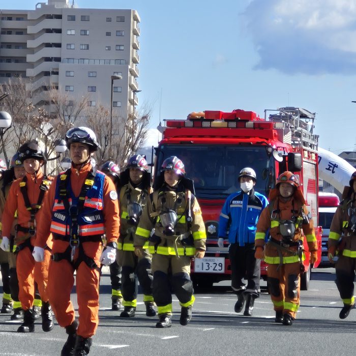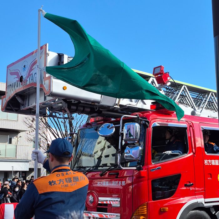 三連休のなか日、強風の吹く中でしたが、子どもたちから高齢者まで、多くの観客のなかで、消防職員、消防団員の皆さんの「消防力」を披露いただけたかと思います。いざというときにいのちを守るために尽力されている皆さんの姿を身近に感じられた式典でした。寝屋川市サービスゲート屋上付近からの降下訓練や梯子車を使用した救出訓練など、見どころ満載でしたよ。