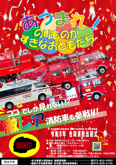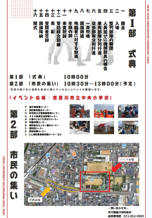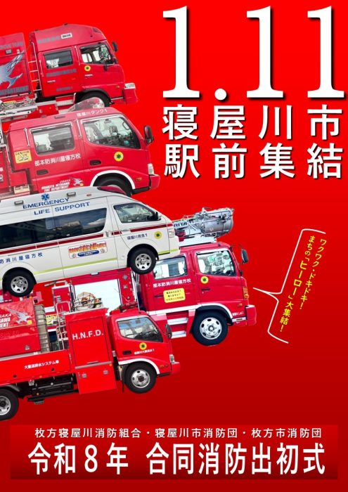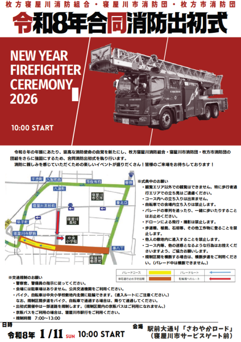 1月11日、枚方寝屋川消防組合、枚方市消防団、寝屋川市消防団の2026(令和8)年合同消防出初式に来賓として出席させていただきました。出初式は、年頭にあたり、崇高な消防使命の自覚を新たにし、枚方寝屋川消防組合・寝屋川市消防団・枚方市消防団の団結をさらに強固にするため開催されている催しです。