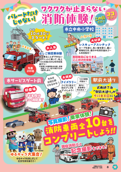 第2部「市民の集い」では、市立小学校のグランドを中心に消防に親しみを感じていただくため、「梯子車搭乗コーナー」、「ミニ消防車(バッテリーカー)乗車コーナー」、「救助体験コーナー」など、消防を身近に感じてもらえるようにと、楽しいイベントも盛りだくさんに準備されていました。