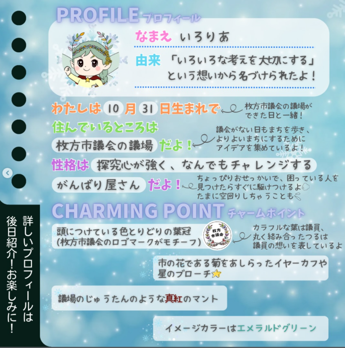 枚方市議会マスコットキャラクター「いろりあ」について、議会報(第360号)で紹介されていました。